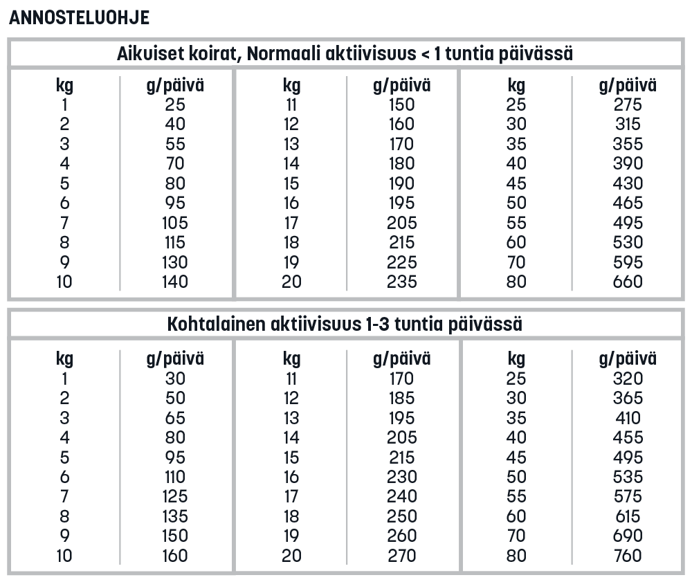 Taulukon ohje on suuntaa-antava. Tarkka ruoan määrä riippuu koiran iästä, aktiivisuudesta ja rodusta. Tarjoa koiralle taulukon ilmoittama määrä ruokaa jaettuna yhteen tai kahteen annokseen päivässä. On suositeltavaa tarkkailla koiran painoa ja lisätä tai vähentää annoskokoa tarpeen mukaan.