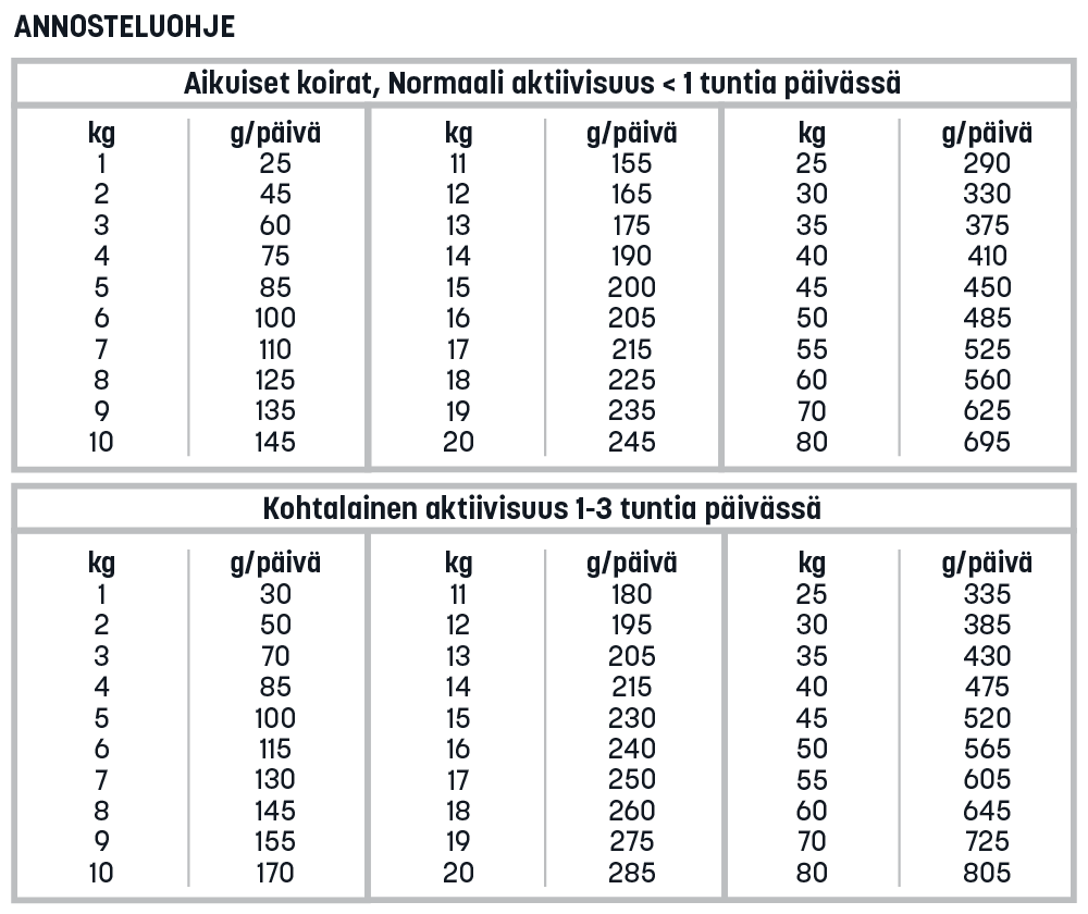 Taulukon ohje on suuntaa-antava. Tarkka ruoan määrä riippuu koiran iästä, aktiivisuudesta ja rodusta. Tarjoa koiralle taulukon ilmoittama määrä ruokaa jaettuna yhteen tai kahteen annokseen päivässä. On suositeltavaa tarkkailla koiran painoa ja lisätä tai vähentää annoskokoa tarpeen mukaan.