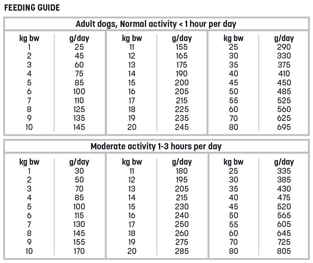 The feeding guide is an indication only, as the nutritional requirement of individual dogs varies according to breed, sex, activity level etc.