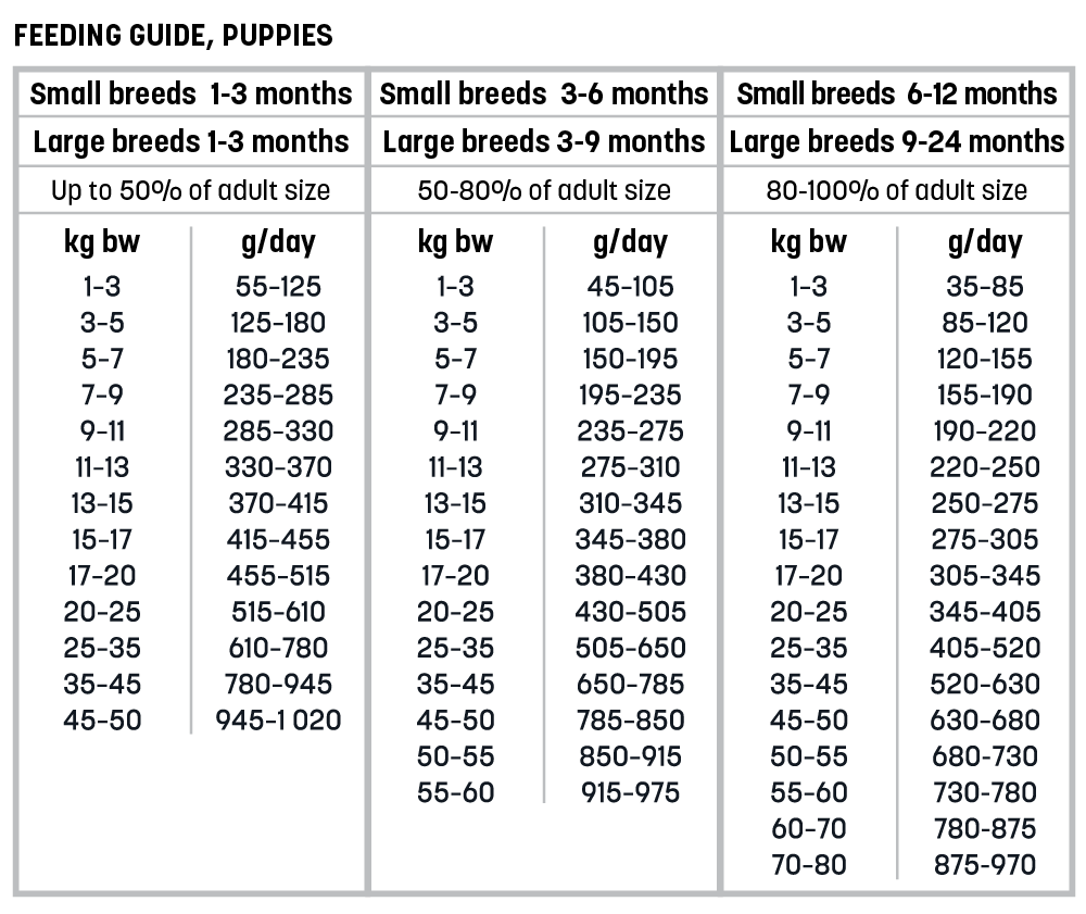 The feeding guide is an indication only, as the nutritional requirement of individual puppies varies according to breed, sex, activity level etc.